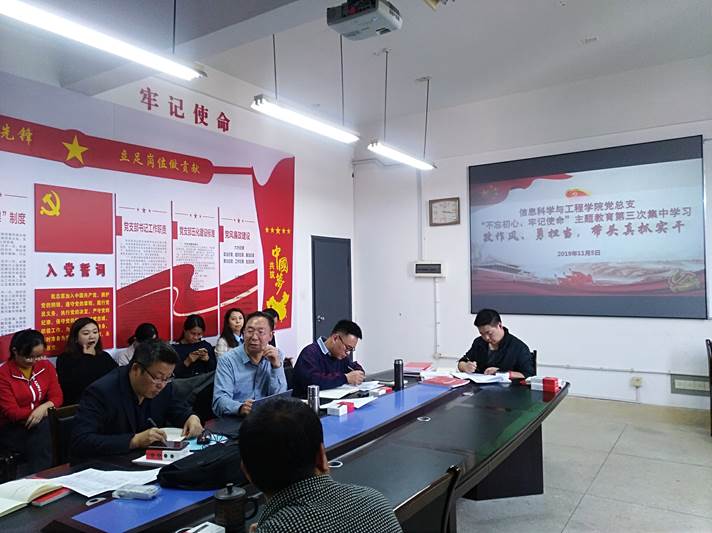 11月5日15时,信息科学与工程88看球NBA 党总支部“不忘初心、牢记使命”主题教育第三次集中学习活动在玉衡楼北407举行。首先,党总支书记王杰文同志强调各党支部要结合“五化建设”,认真落实主题学习各项要求,组织党员对照党章党规按照“十八个是否”找准差距,检视问题,积极整改。随后,党总支副书记成夏炎同志围绕 “改作风、勇担当,带头真抓实干”作了主题发言,强调作为一名高校教育工作者,我们的初心与使命就是立德树人,为党育才,为国育人,也就是为培养中国特色社会主义的合格建设者和可靠接班人而努力。希望88看球NBA 全体教师居安思危,利用这次主题教育的机会,找准差距逐一落实,改作风、勇担当,带头真抓实干,成为一名传其以德,授之以学,解其之惑的合格教师。