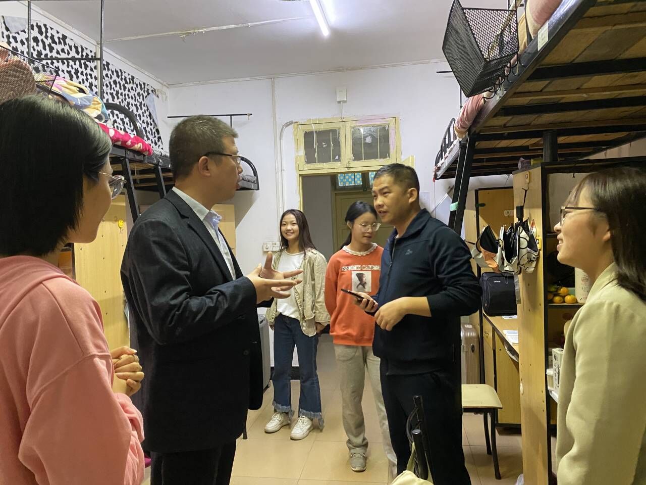 田祖伟院长在查看内务的同时也不忘关心学生:“同学们在平时的生活中不仅要友爱互助,更要重视安全卫生,树立优良寝风,助益学习成绩提高和个人健康成长。”