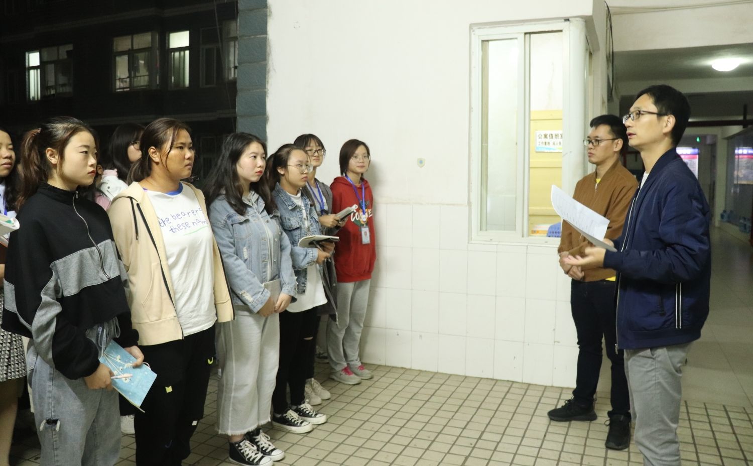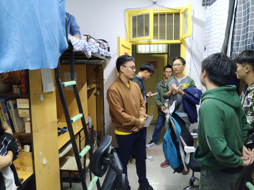 党总支副书记成夏炎带领辅导员和学生干部深入学生宿舍查看卫生、内务整理状况,开展以宿舍走廊安全通道的规范化建设情况为重点的安全隐患排查工作,同时看望慰问各年级学生,并详细了解了学生近期思想、学习和生活情况。