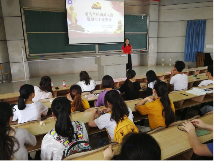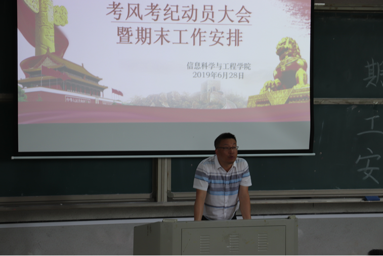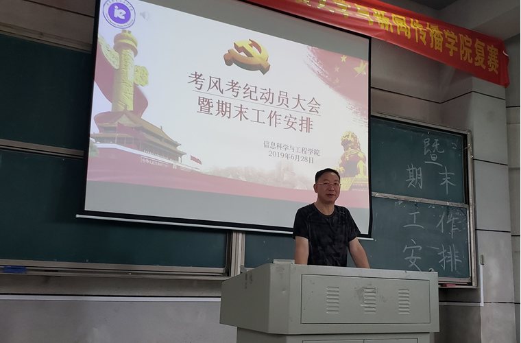 2019年6月28日星期五中午于润寰南105教室顺利召开考风考纪动员大会暨期末工作安排大会。院党总支书记王杰文教授、副书记易利老师、副院长田祖伟教授、王建军教授、学工办全体辅导员,还有88看球NBA