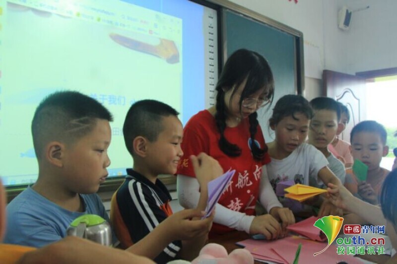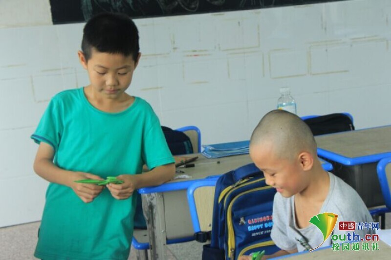 图为手工课上已经学会折恐龙的孩子热情地教还未学会的同学。中国青年网通讯员 王彬艳摄