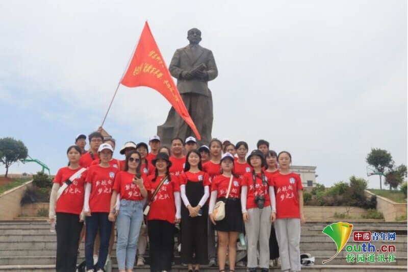 图为新航向·梦之队队员前往张国基纪念馆时在张国基老先生铜像前的合影。中国青年网通讯员 段新利 摄
