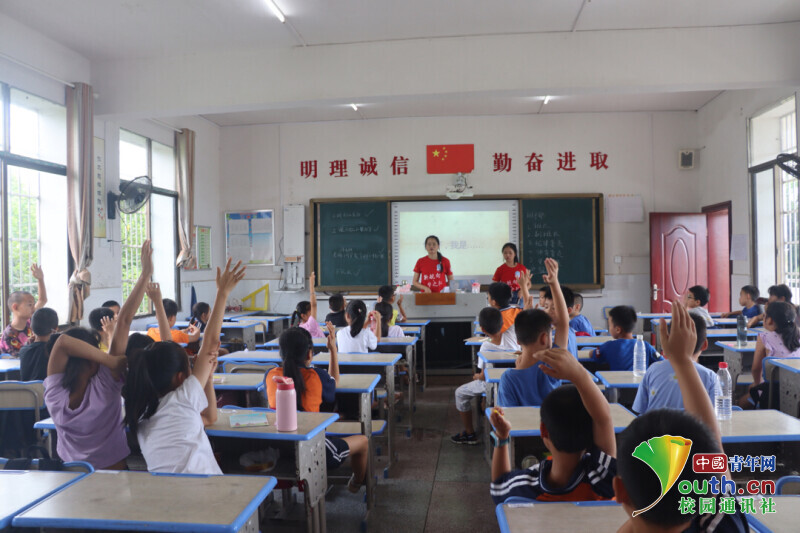 图为红色趣味故事会上志愿者老师举手示范,引导同学们积极举手发表自己的想法。中国青年网通讯员 段新利 摄