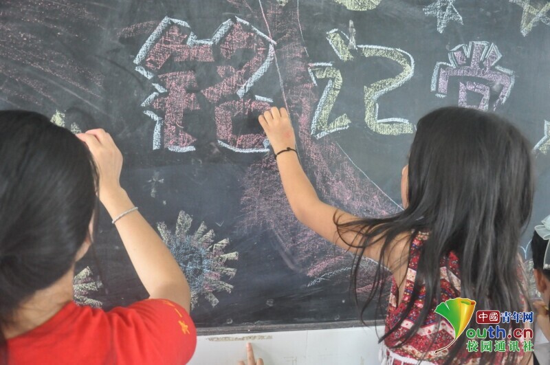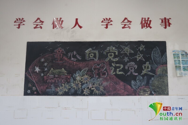 图为向日葵班班主任用彩色粉笔书写粉笔画的主题,打算用白色粉笔小心勾勒出轮廓。中国青年网通讯员 欧阳健 摄