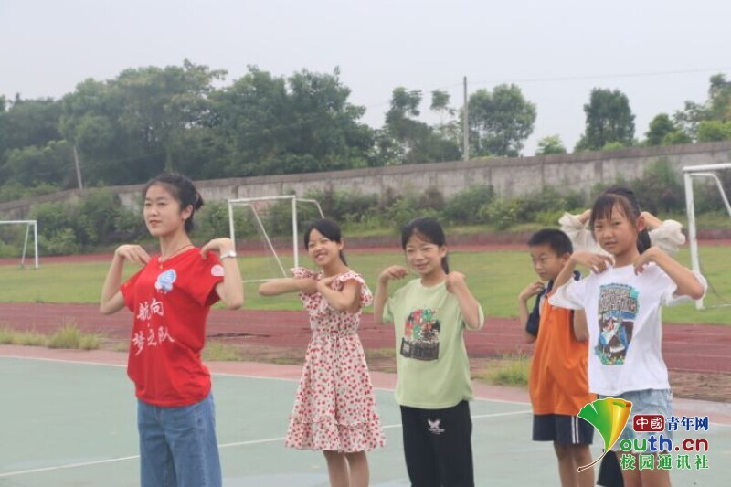 图为运动会开始之前,孩子们在志愿者的带领下一起进行热身运动。中国青年网通讯员 段新利 摄