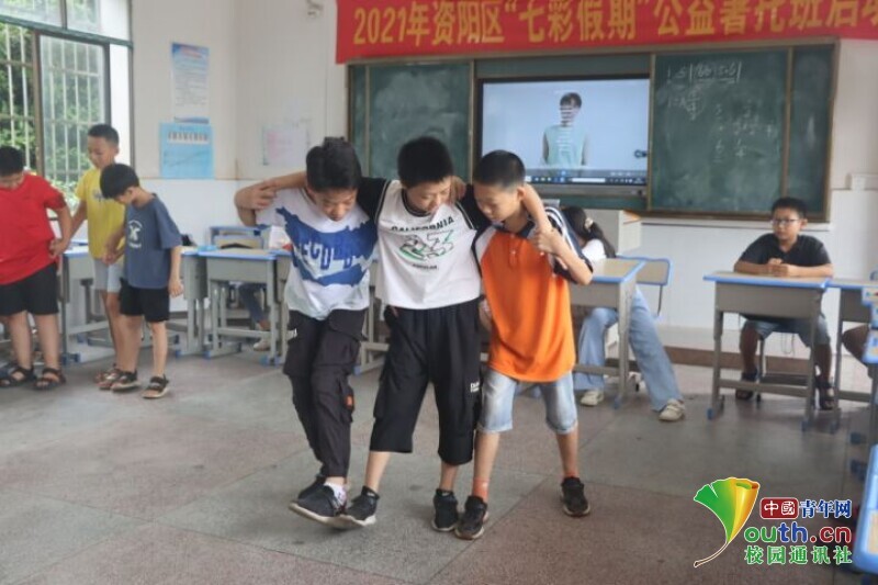 图为孩子们团结协作一起进行三人四足的比赛。中国青年网通讯员 段新利 摄