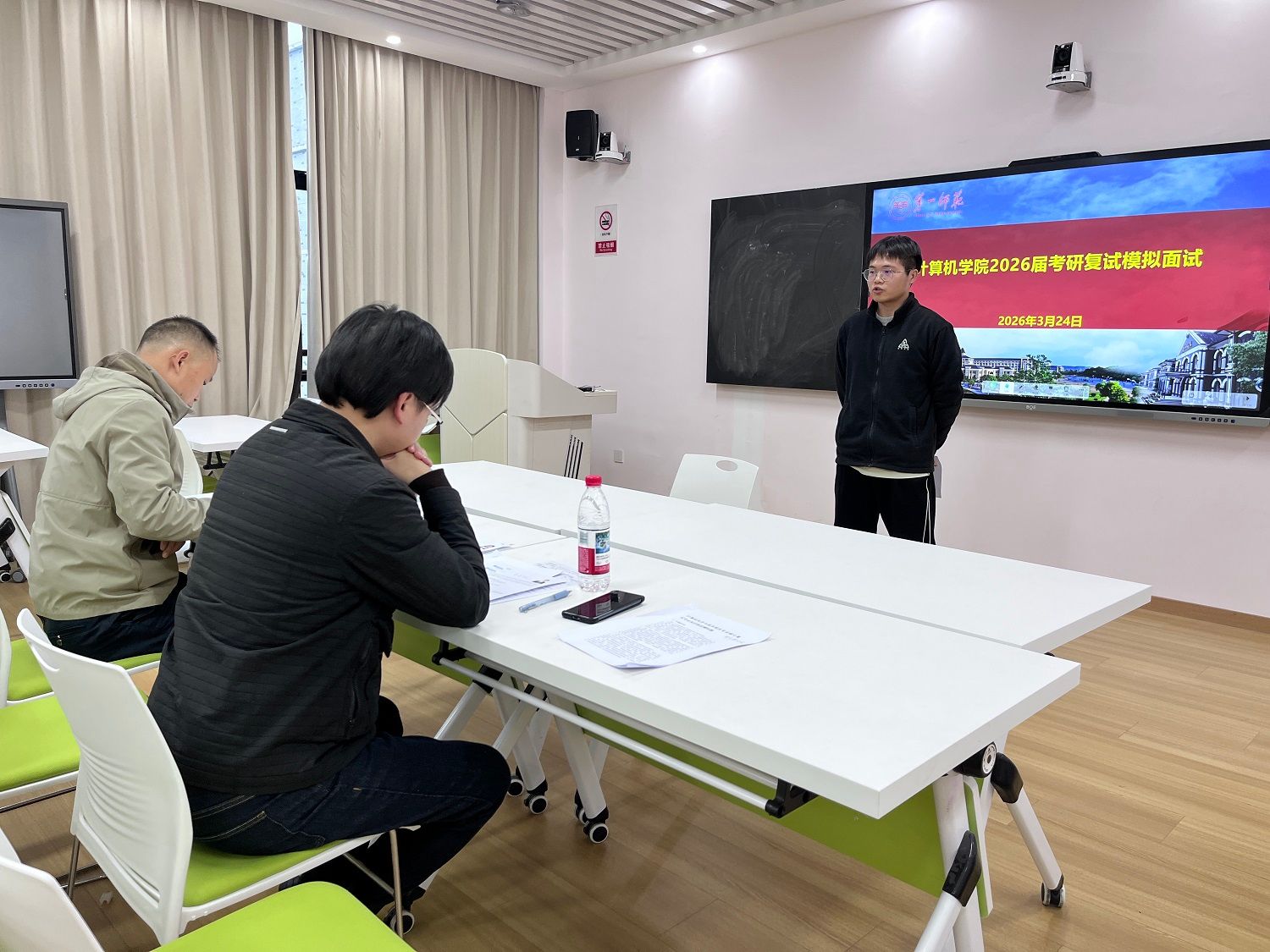 在立园楼组织开展了考研模拟面试。活动模拟真实复试场景,分设两个考场同步进行。每位学生的模拟面试总时长约12分钟,流程包括中英文自我介绍、专业问答等环节,全面考察学生的语言表达、专业知识与临场应变能力。参与学生以饱满积极的状态投入演练,在实践中发现不足、优化策略,为正式复试奠定了扎实基础。